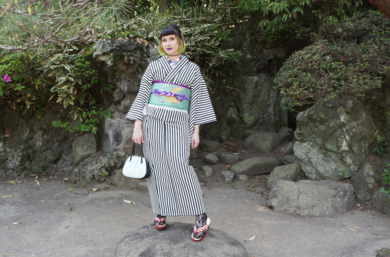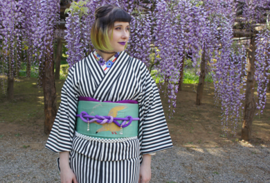 | 着物について | 豆千代モダン風味のストラップ着物とアンティークの名古屋帯です。 藤の花の前でコントラストは良いと思ってスタイリングしました。帯揚げと帯締めは藤の色と合わせた紫色です。 下駄はふりふです。 |