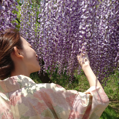 | 着物について | 長時間運転の為、楽な紬と半幅帯をコーディネートしました。藤の紫を邪魔しないように白地にしました。 |