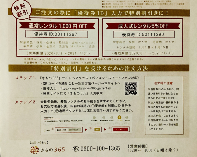 ◆通常レンタル(成人式以外の着物)1,000円OFF 優待券ID→ 00111367